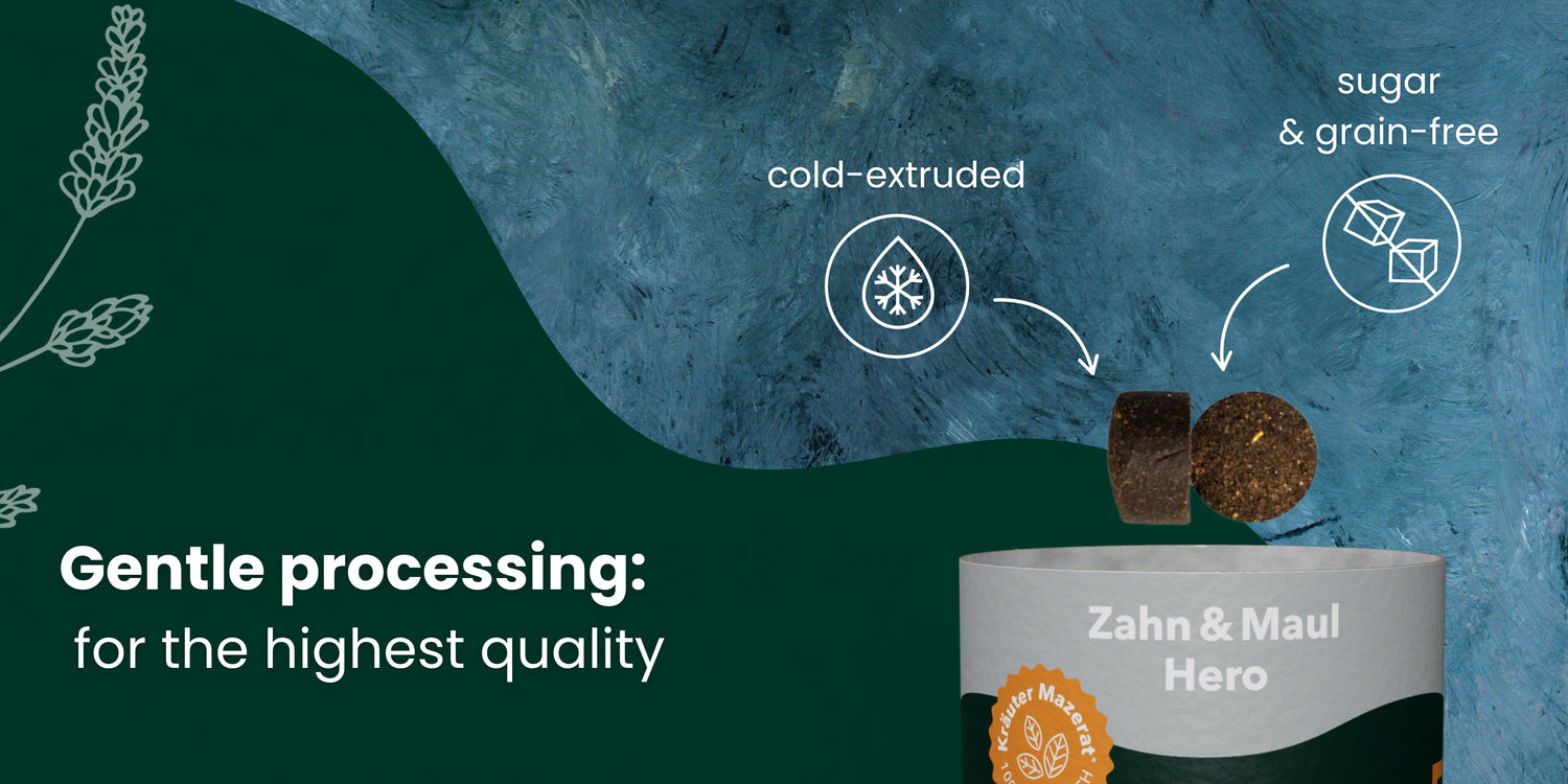 Our drops are produced using the cold extrusion process, in which the ingredients are gently processed at low temperatures. This preserves valuable nutrients such as vitamins and the natural flavor. This gentle processing ensures high digestibility and the best possible nutrient absorption – perfect for your dog. The process is also more environmentally friendly, as it uses less energy than conventional methods.