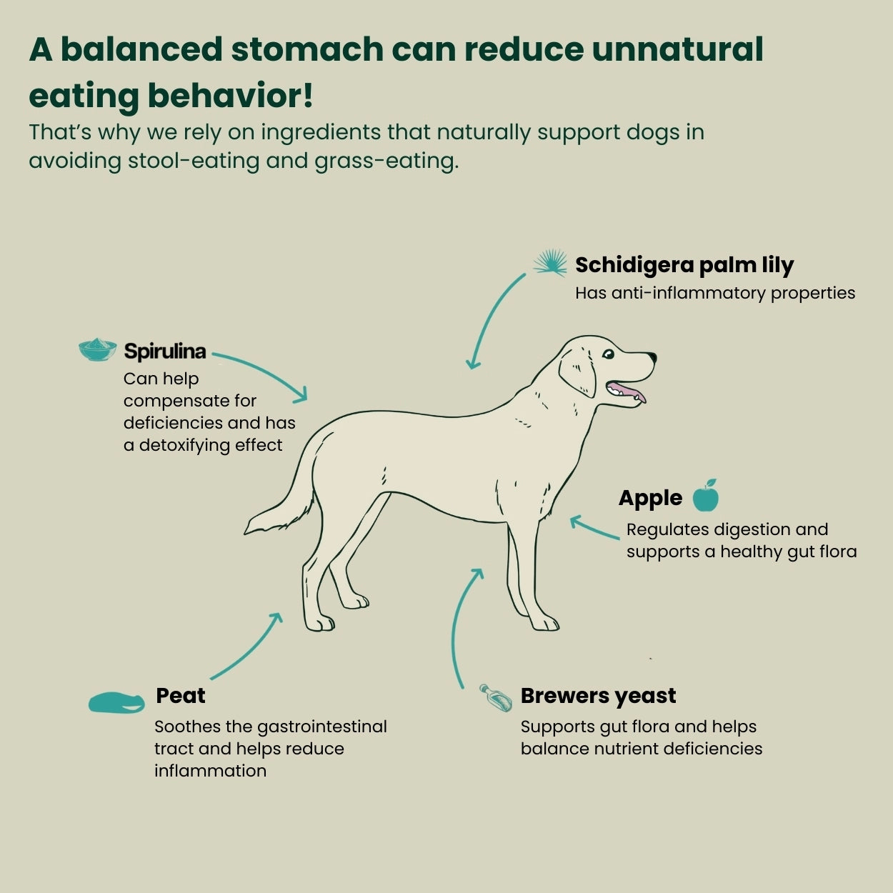 The Stool & Grass Control Drops contain a unique combination of ingredients, including a specially developed herbal macerate that ensures optimal intestinal absorption of valuable nutrients. Combined with spirulina, casein, brewer's yeast, apple, yucca shidigera, banana, peat, lecithin, pineapple, insect fat, and rosemary powder, this blend provides perfect support for your dog's digestion and overall well-being, promoting healthy digestion and balanced eating habits.